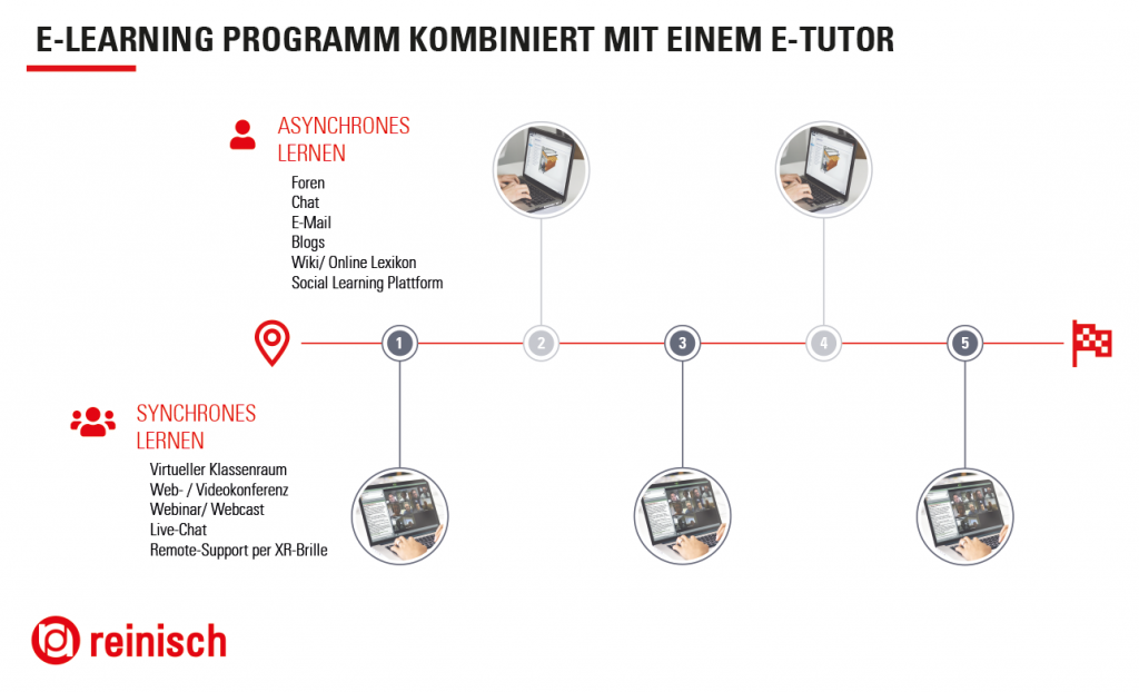 Der E-Tutor übernimmt die Funktion des Trainers bei Präsenzschulungen und gibt Hilfestellungen oder beantwortet Fragen. Kommunikation ist bei einem Präsenztraining ein entscheidender Bestandteil des Lernprozesses. Durch den Einsatz von virtuellen Klassenräumen, Webkonferenzen, Remote-Support per Mixed-Reality-Brille, Chats und Foren gewährleisten Sie auch ohne die Präsenz des Trainers eine enge Kommunikation zwischen Lernenden und Trainer.